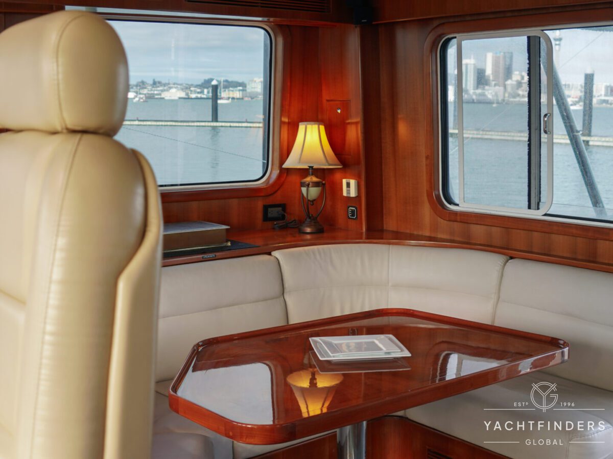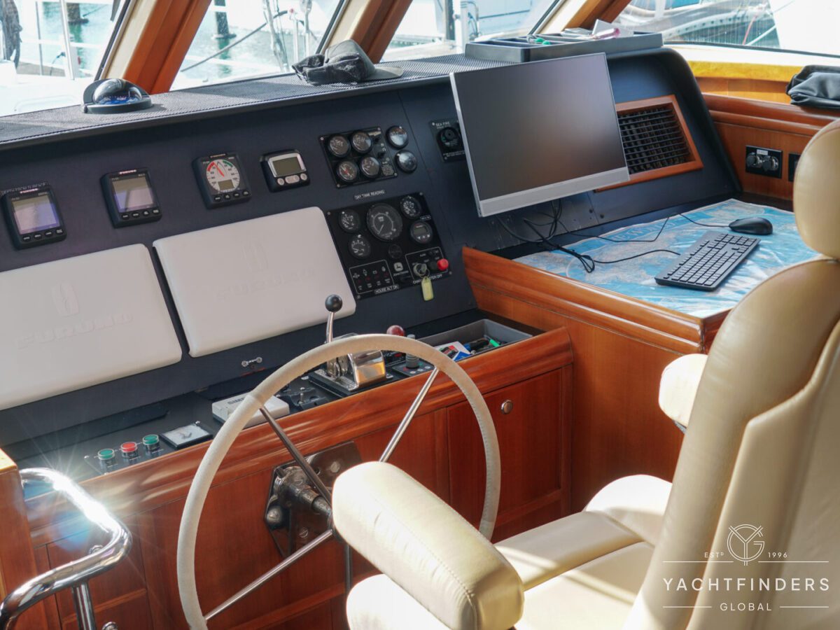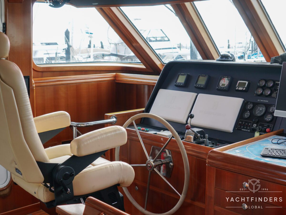The saloon transitions seamlessly into the pilothouse, which features a single helm chair and a large chart table for navigation purposes. Smartly equipped panels display navigation and instrumentation controls, and port and starboard pilothouse doors provide direct access to the foredeck and forward sailing cockpit.