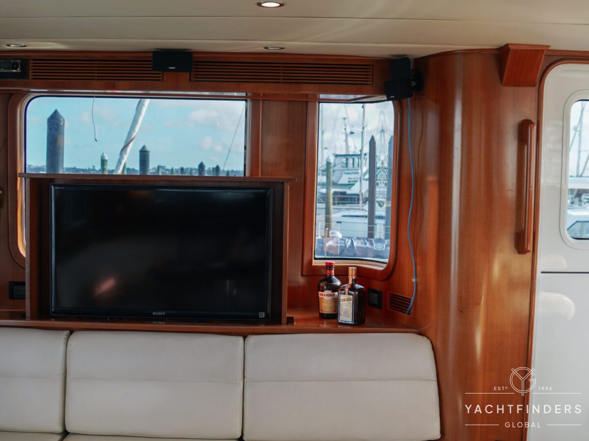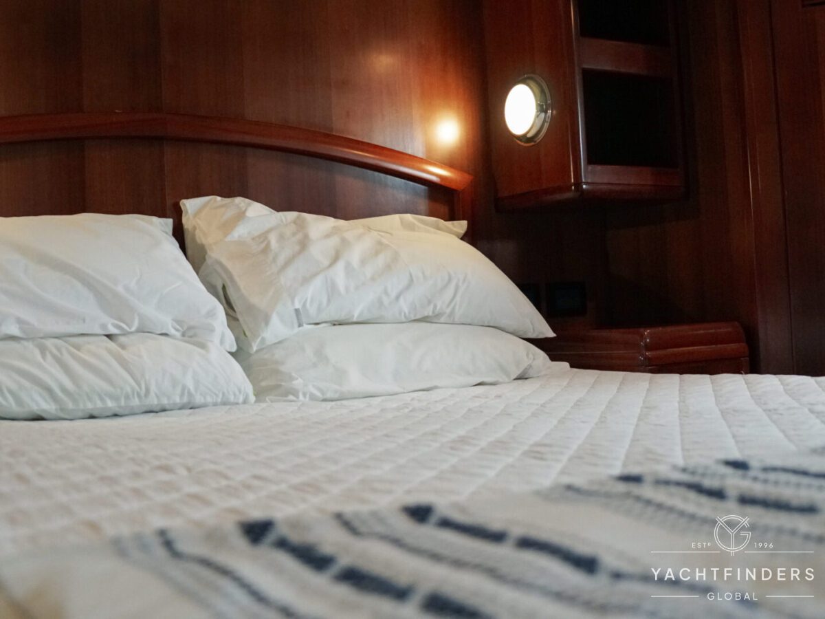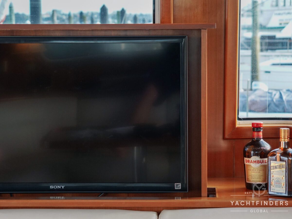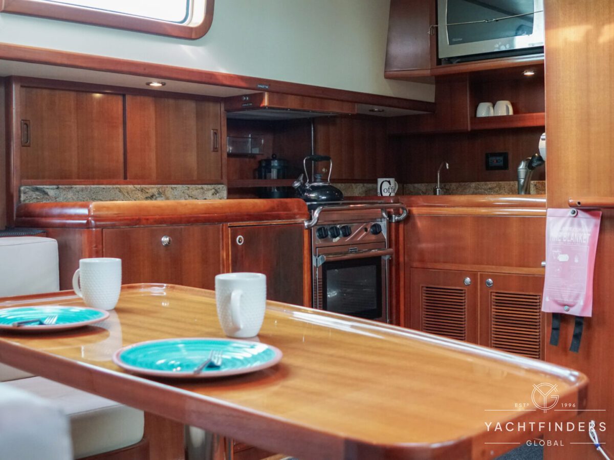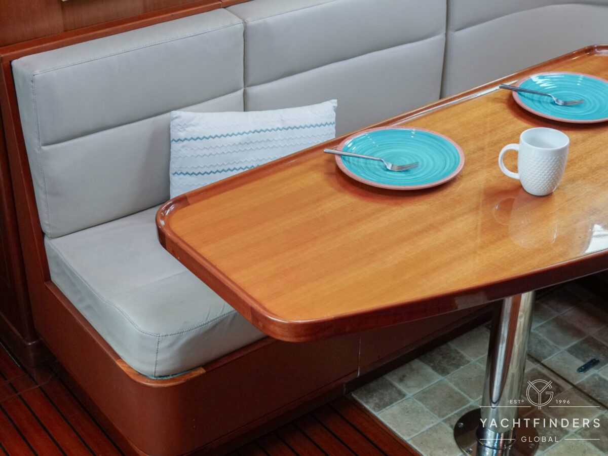 Upon entering the saloon from the cockpit, guests are welcomed into an inviting space marked by refined design and panoramic views. The starboard side boasts a U-shaped built-in settee with a fixed table, perfect for gatherings. Opposite, the port side features a straight settee with storage, accompanied by a 40” Samsung LED TV mounted on an Artix lift for entertainment.