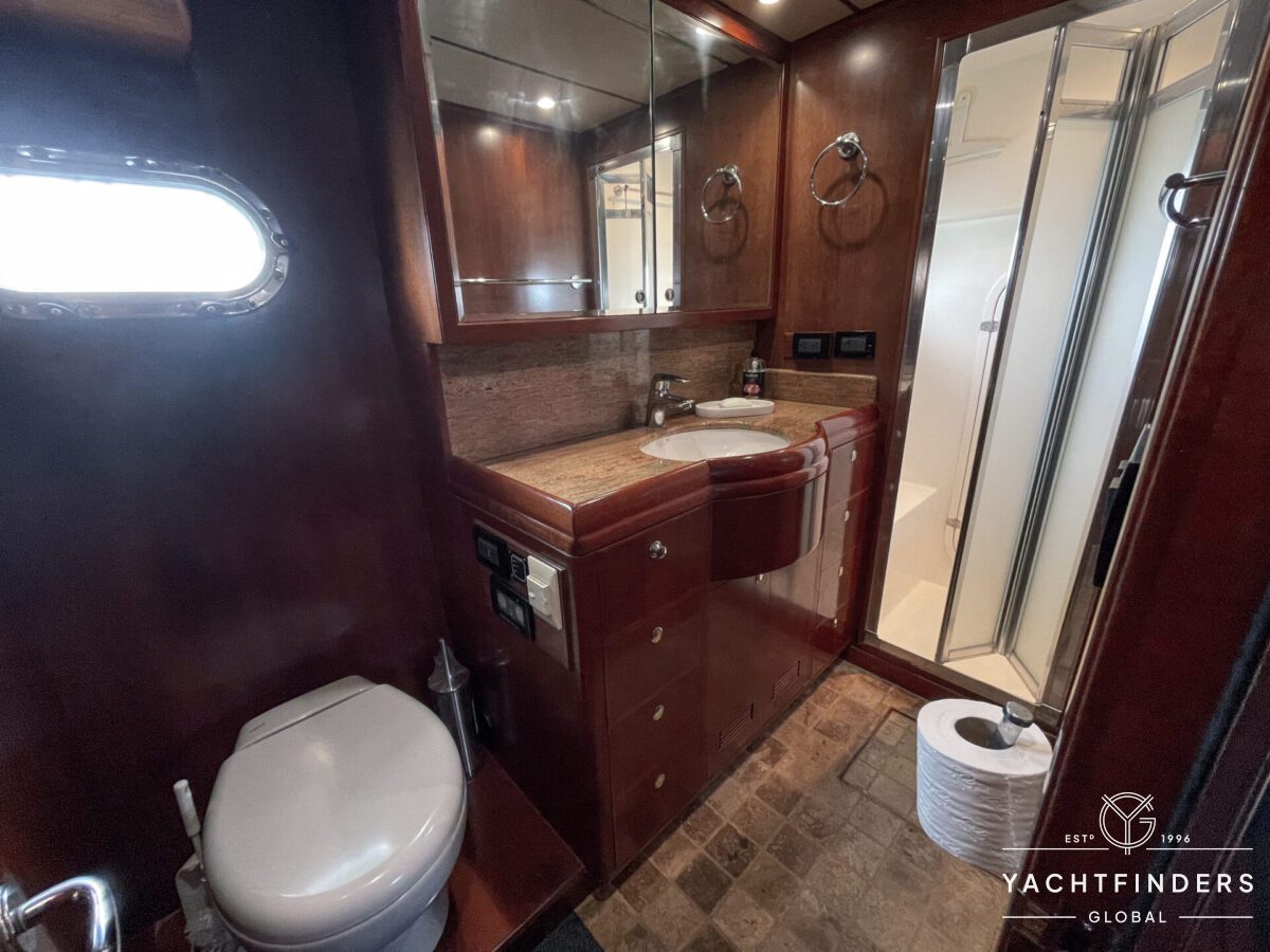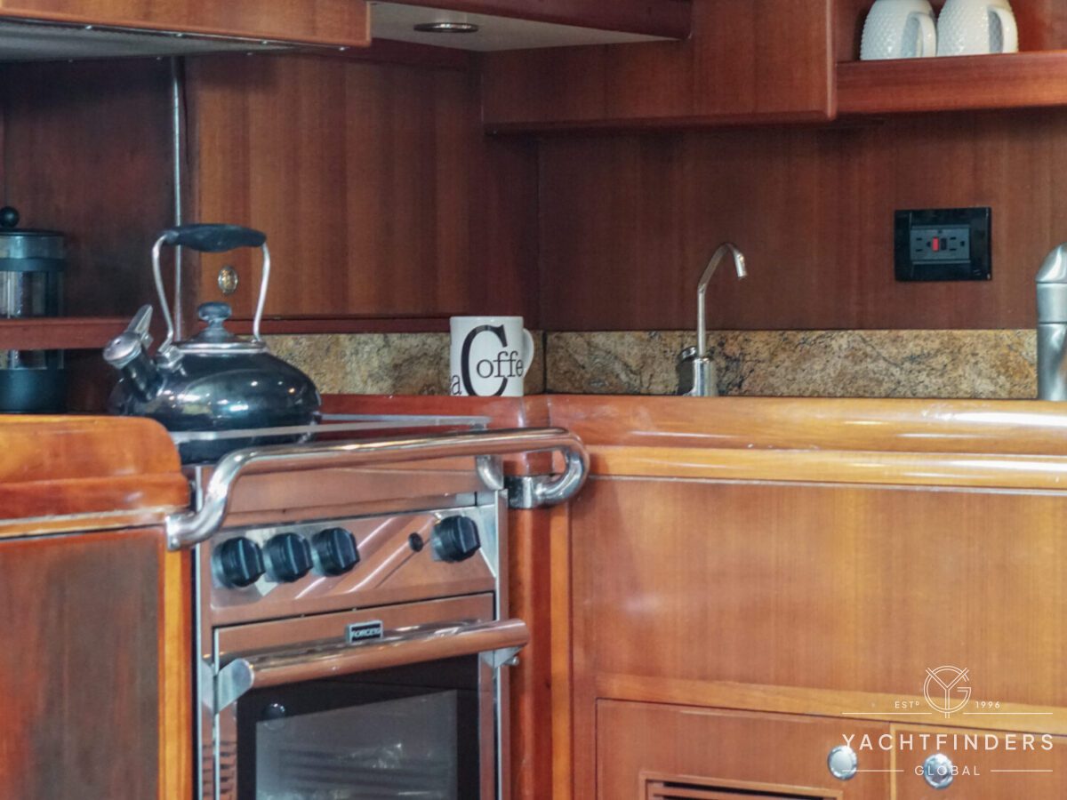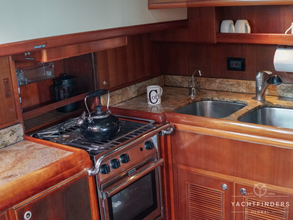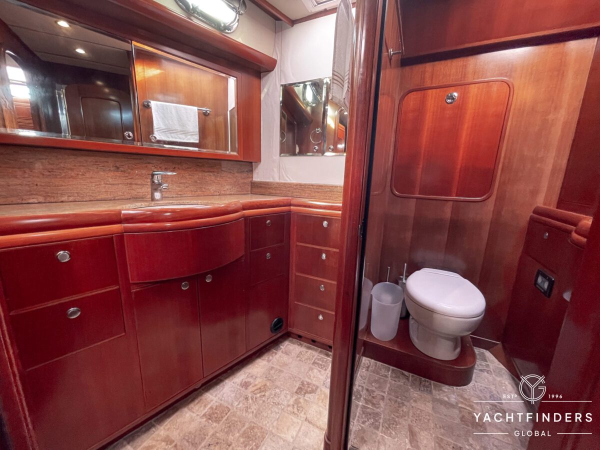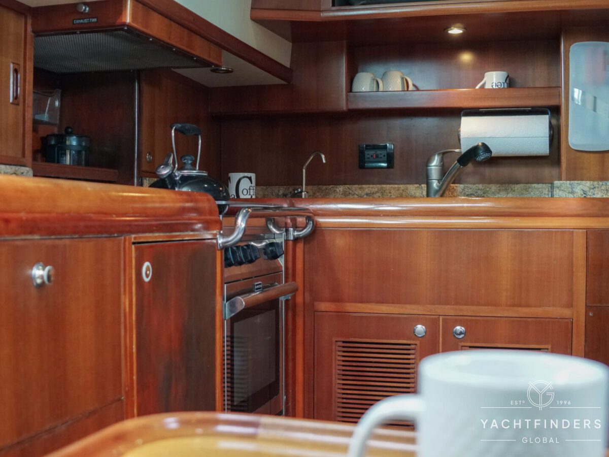 Upon entering the saloon from the cockpit, guests are welcomed into an inviting space marked by refined design and panoramic views. The starboard side boasts a U-shaped built-in settee with a fixed table, perfect for gatherings. Opposite, the port side features a straight settee with storage, accompanied by a 40” Samsung LED TV mounted on an Artix lift for entertainment.