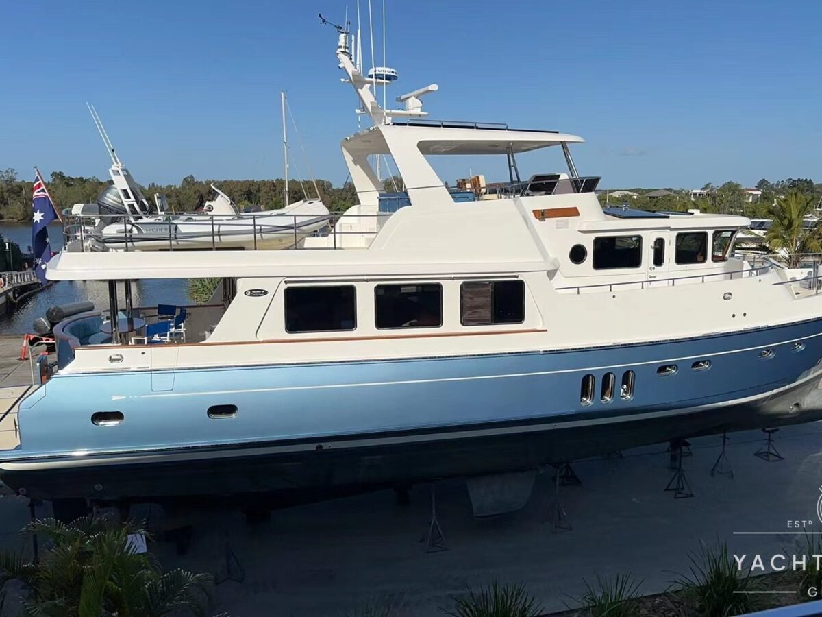 and Selene 62/66 series. She features a full-height engine room, and a separate crew’s quarters aft with a transom door. An expansive and