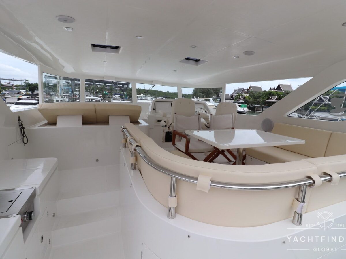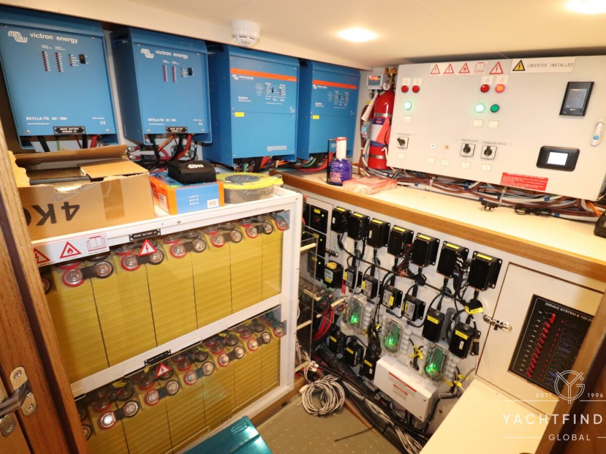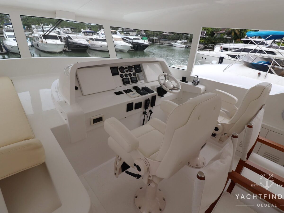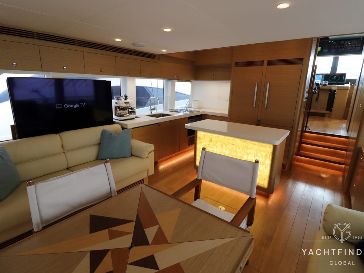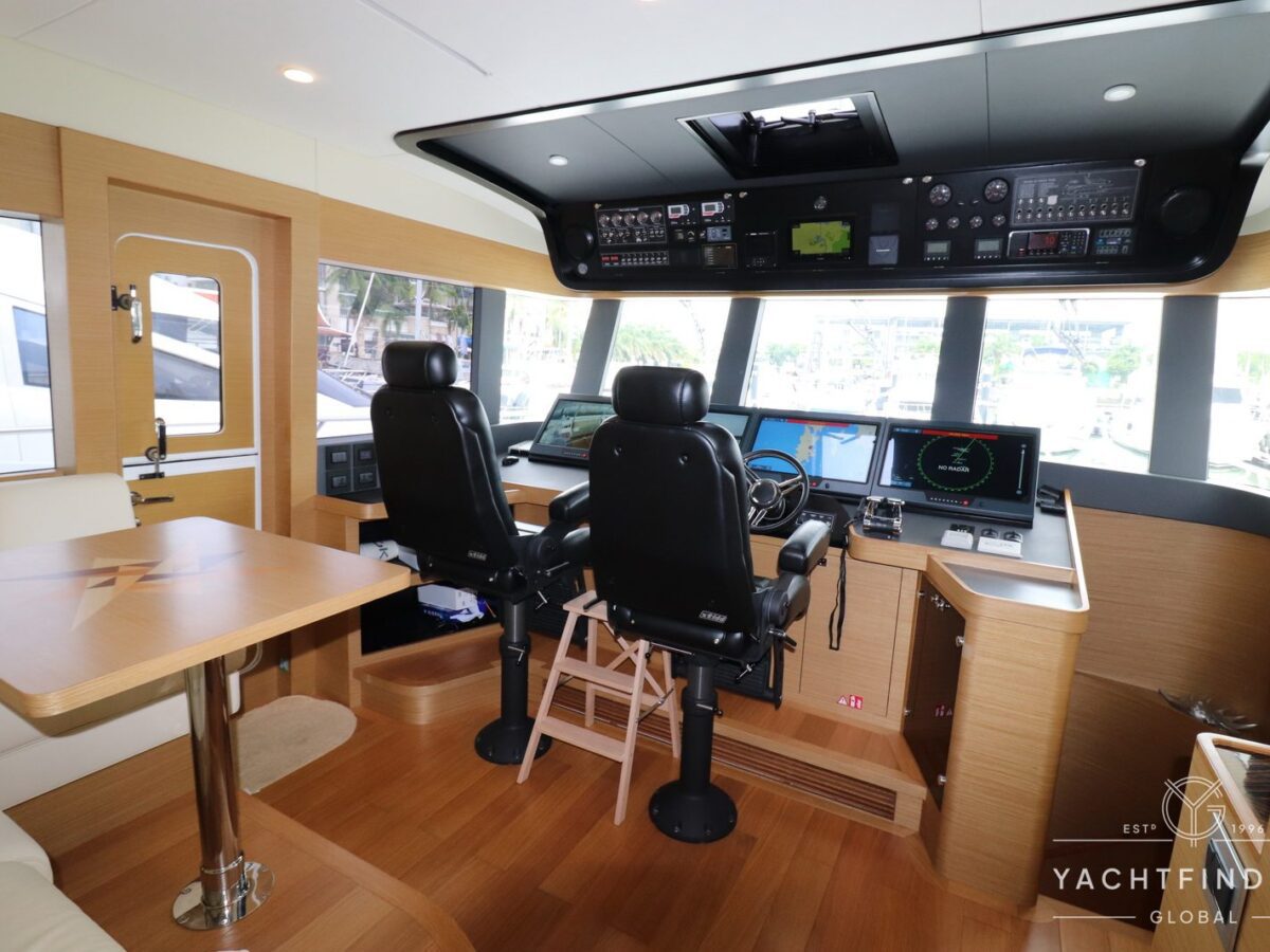 A large saloon and galley area is offset, and the side deck is on the starboard side only providing maximise interior volume. The lower helm gives the impression of a small ship with four Furuno 24-inch touch screens chart plotters.