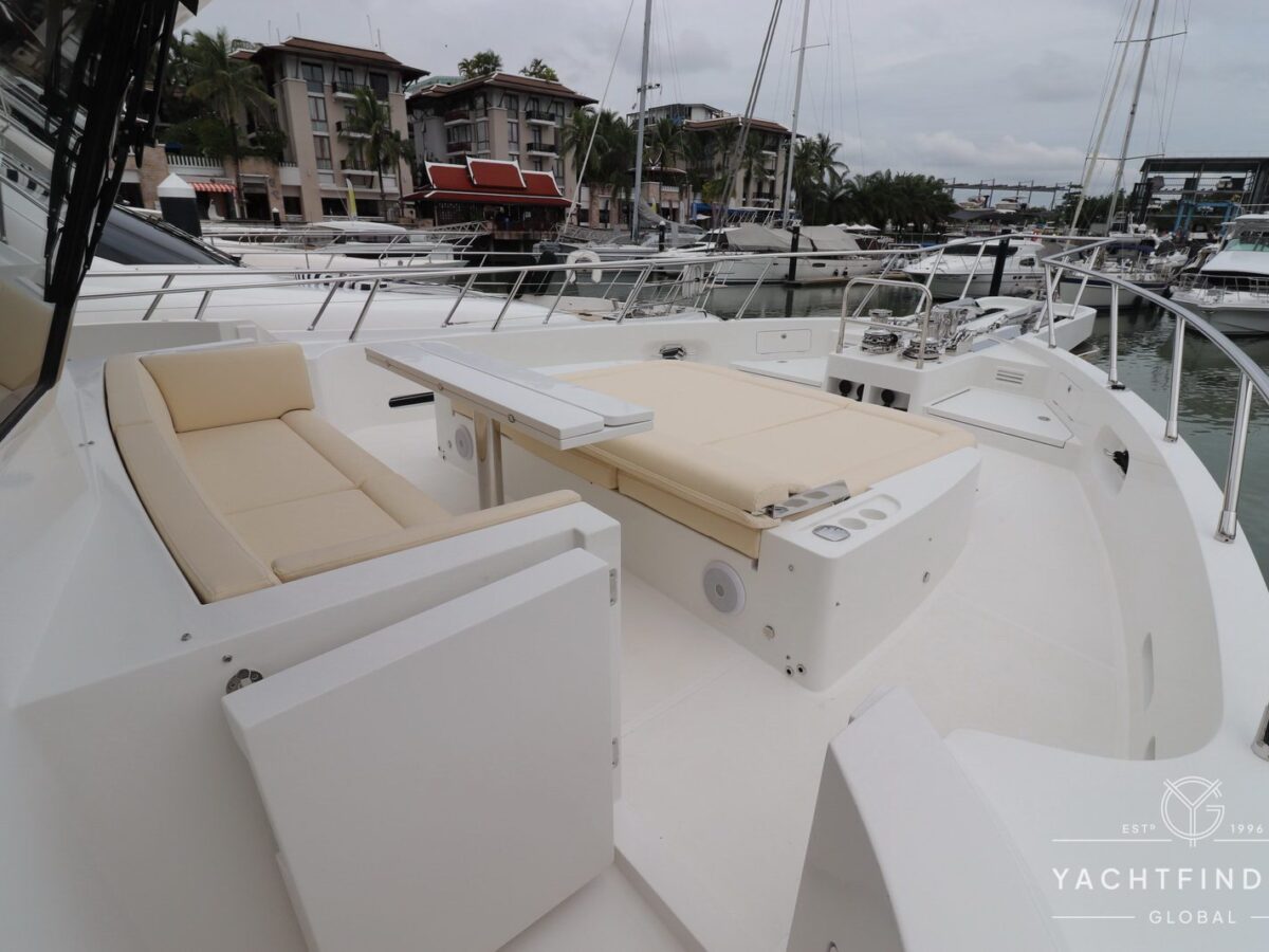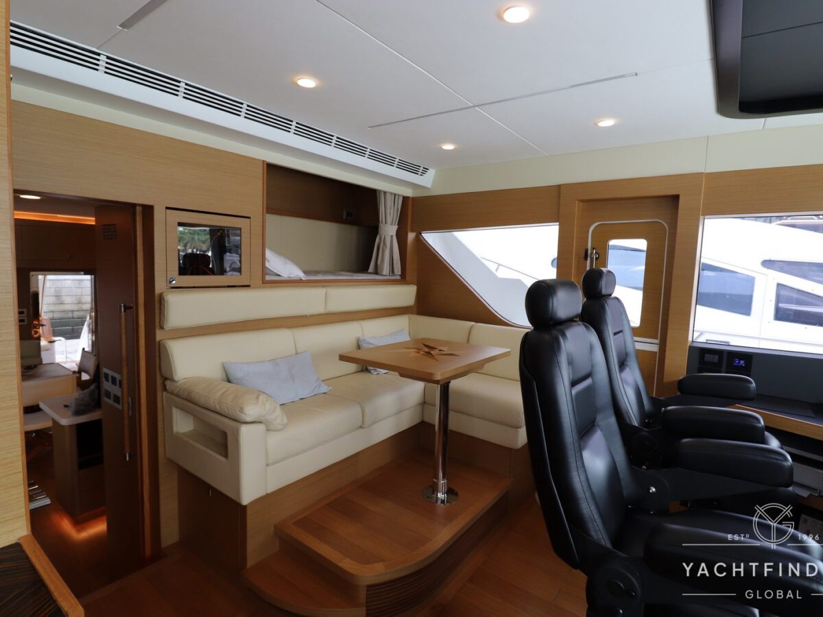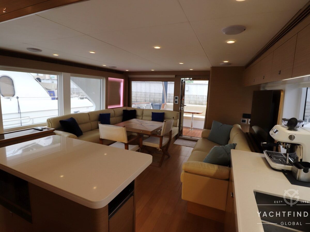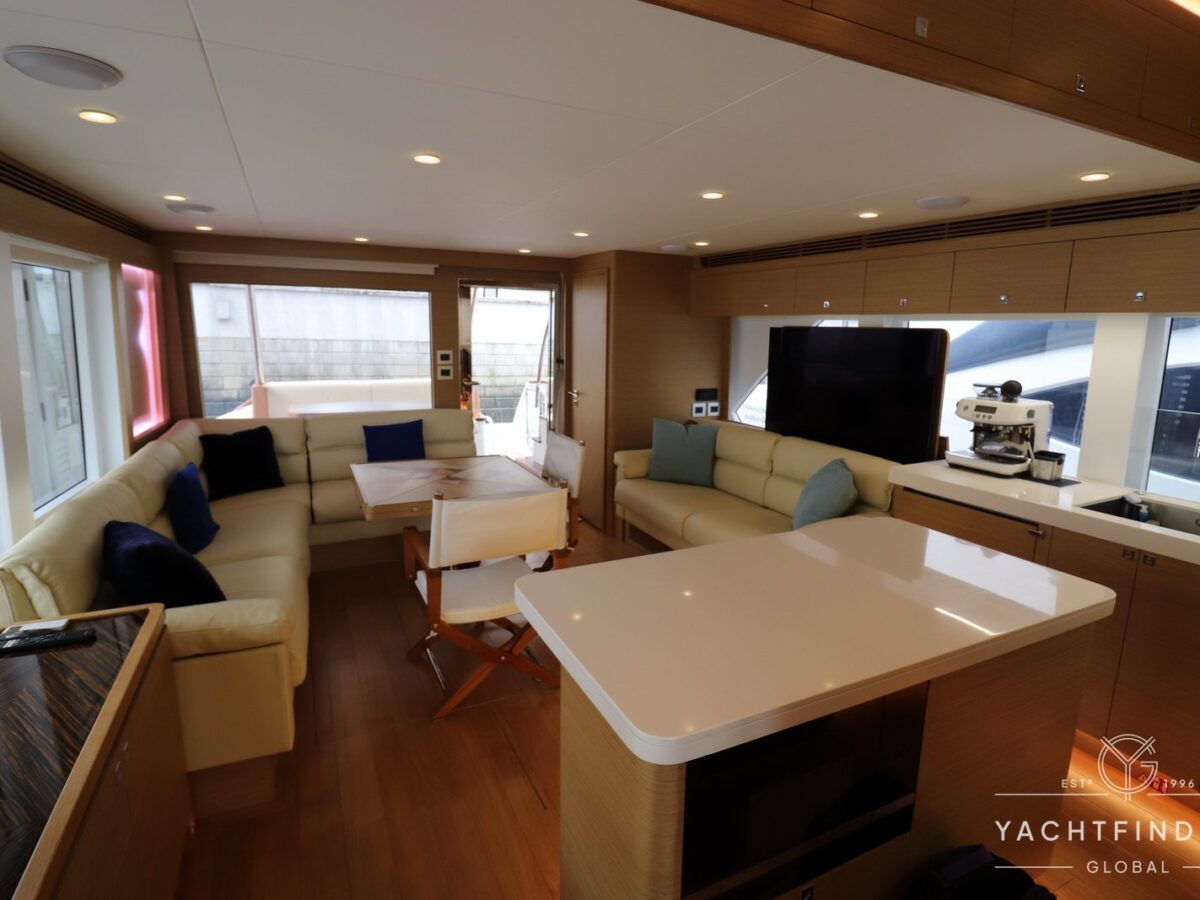 A large saloon and galley area is offset, and the side deck is on the starboard side only providing maximise interior volume. The lower helm gives the impression of a small ship with four Furuno 24-inch touch screens chart plotters.