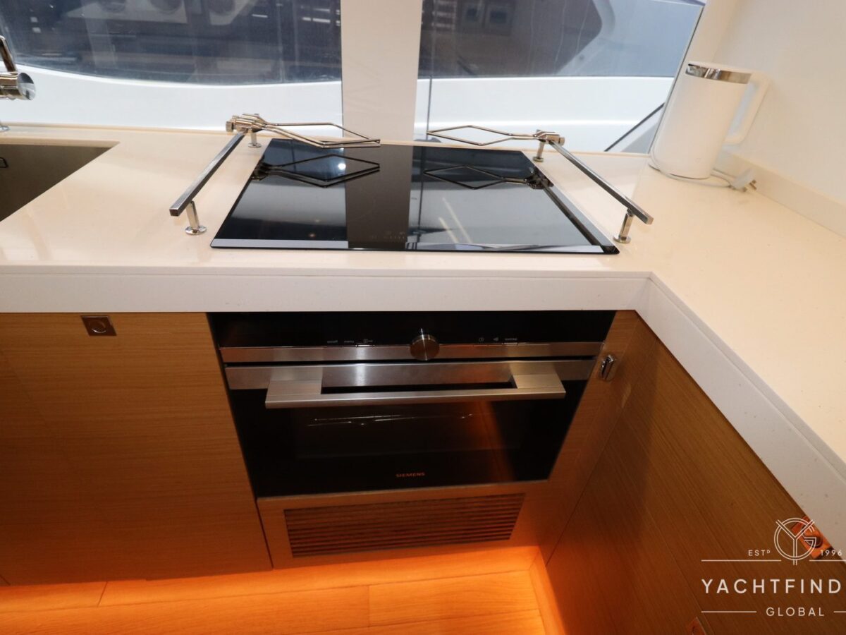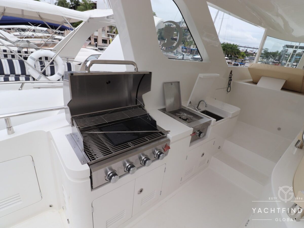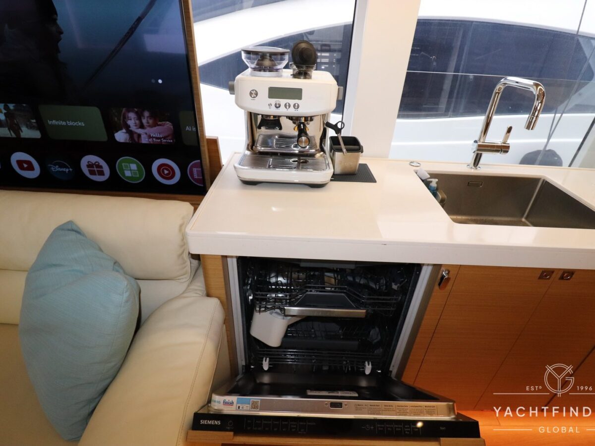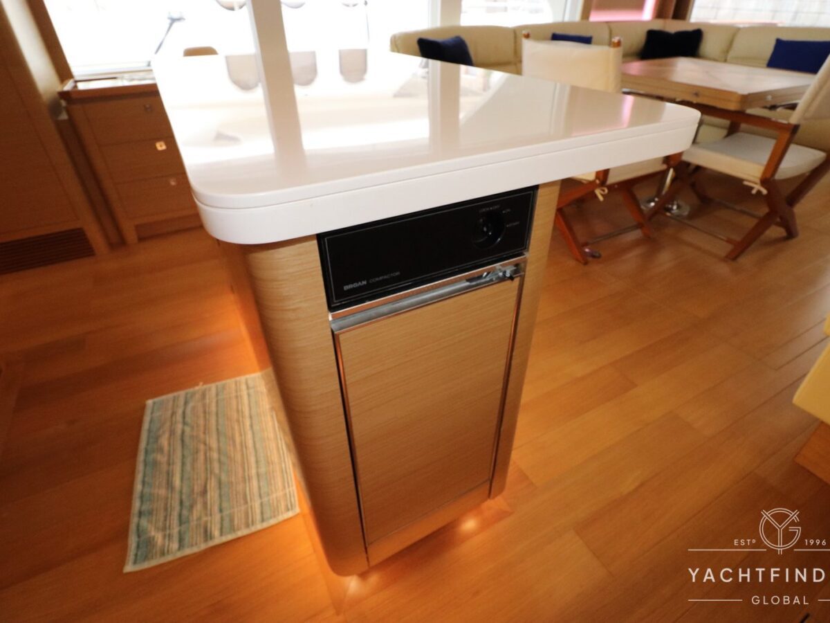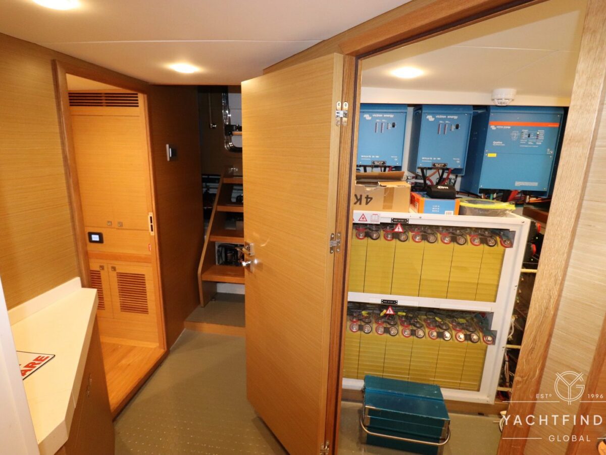 A large saloon and galley area is offset, and the side deck is on the starboard side only providing maximise interior volume. The lower helm gives the impression of a small ship with four Furuno 24-inch touch screens chart plotters.