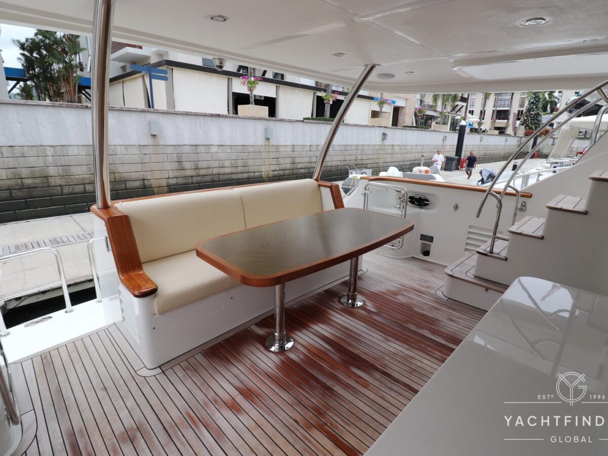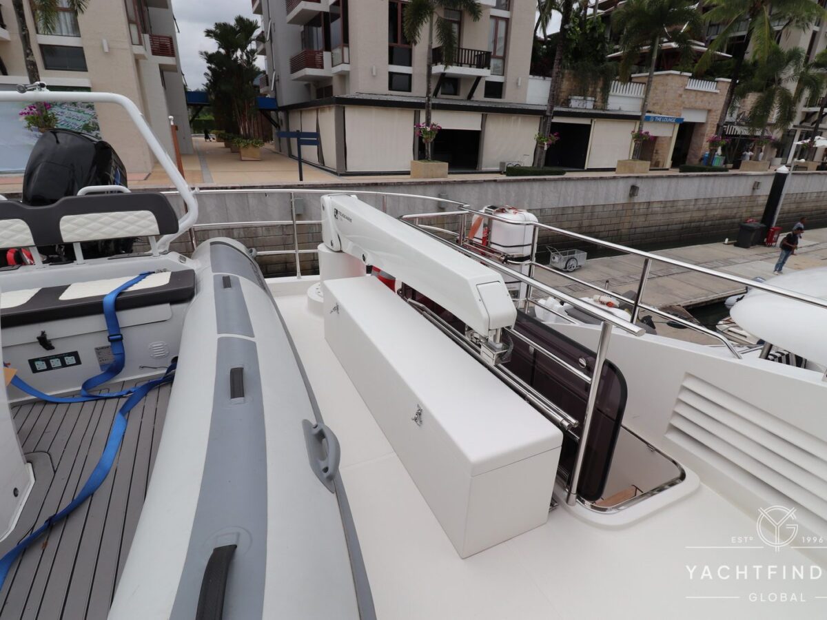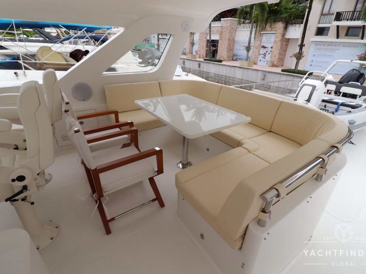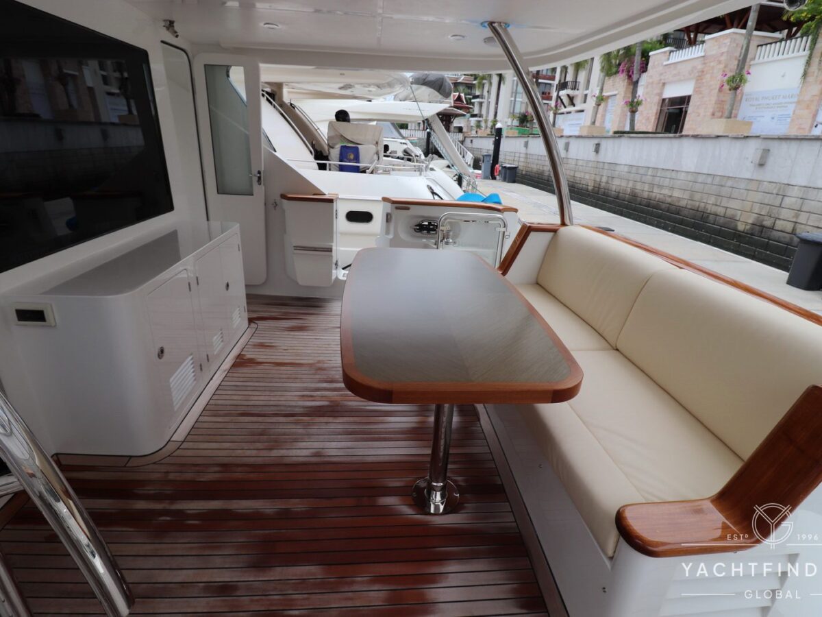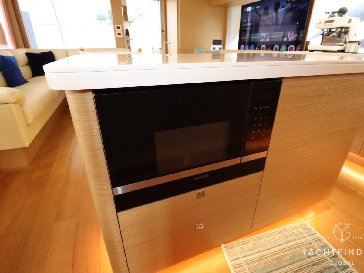 A large saloon and galley area is offset, and the side deck is on the starboard side only providing maximise interior volume. The lower helm gives the impression of a small ship with four Furuno 24-inch touch screens chart plotters.