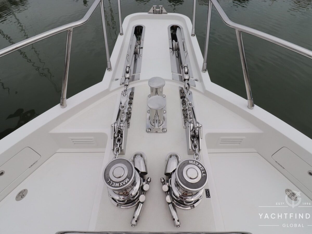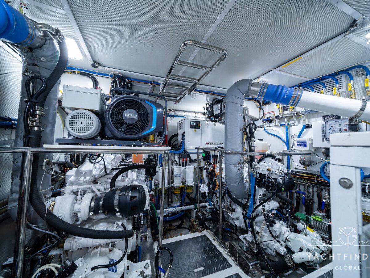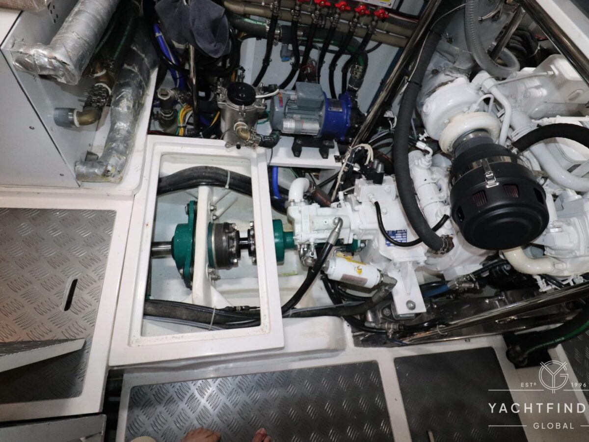 Powered by twin John Deere 4045AFM85 180hp engines, it can reach a top speed of 11 knots and cruise at 9 knots for 1,300 nautical miles. There are two Northern Lights generators of 10 and 26 kw, with the larger generator also having a PTO (get home system) to power the hydraulic system as well as PTO pumps on both engines to power the Trac bow & stern thrusters, twin Maxwell windlasses and