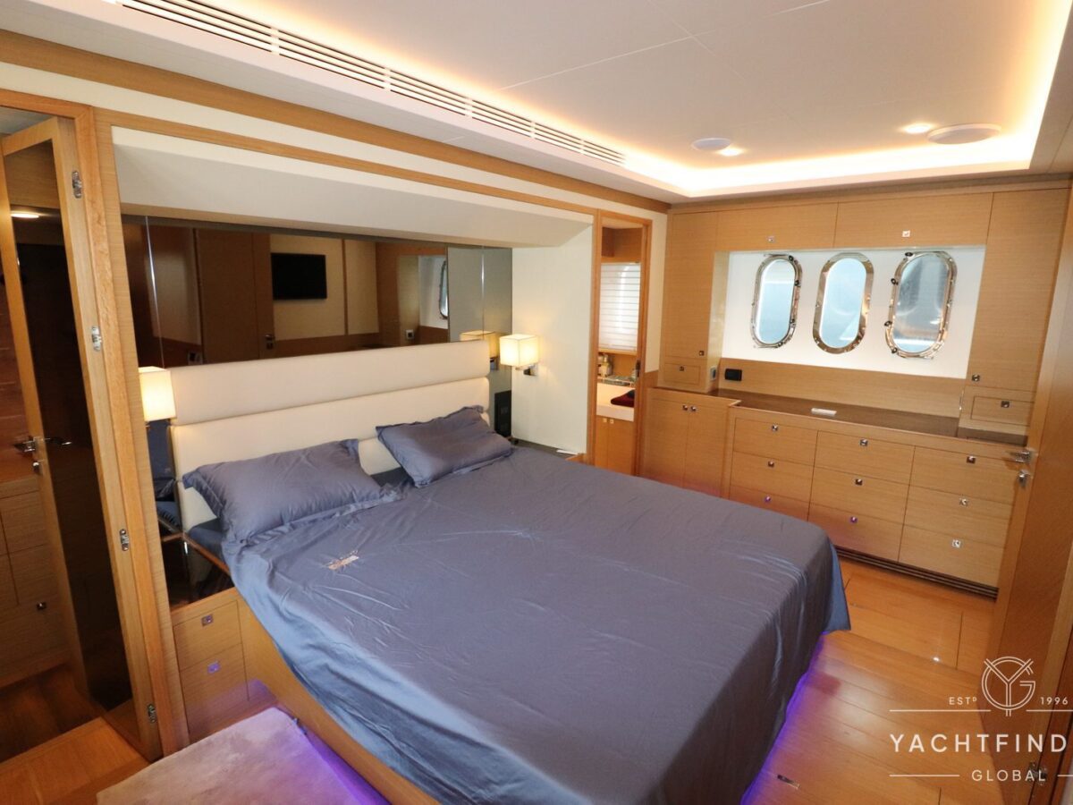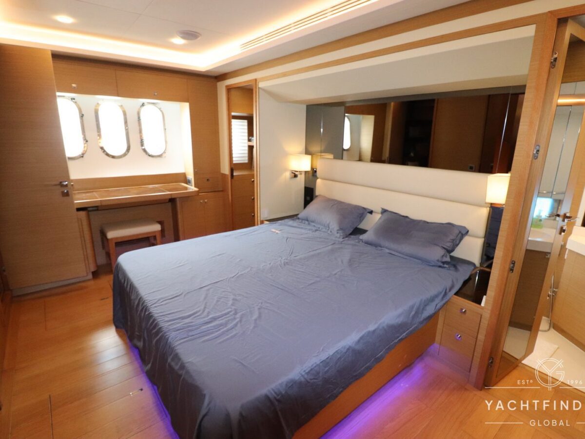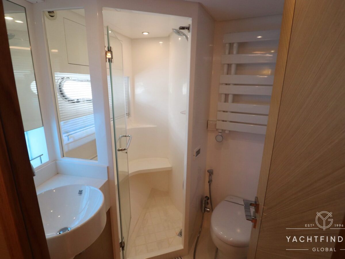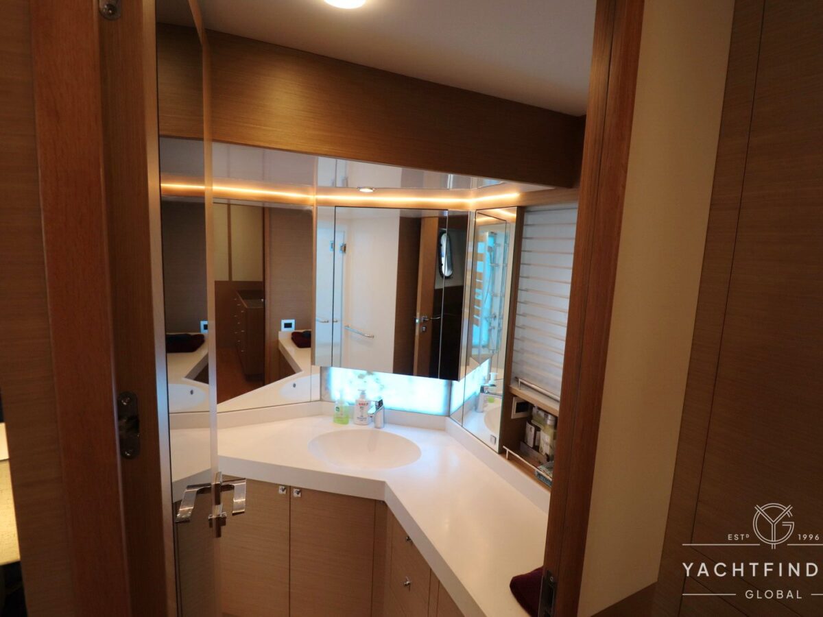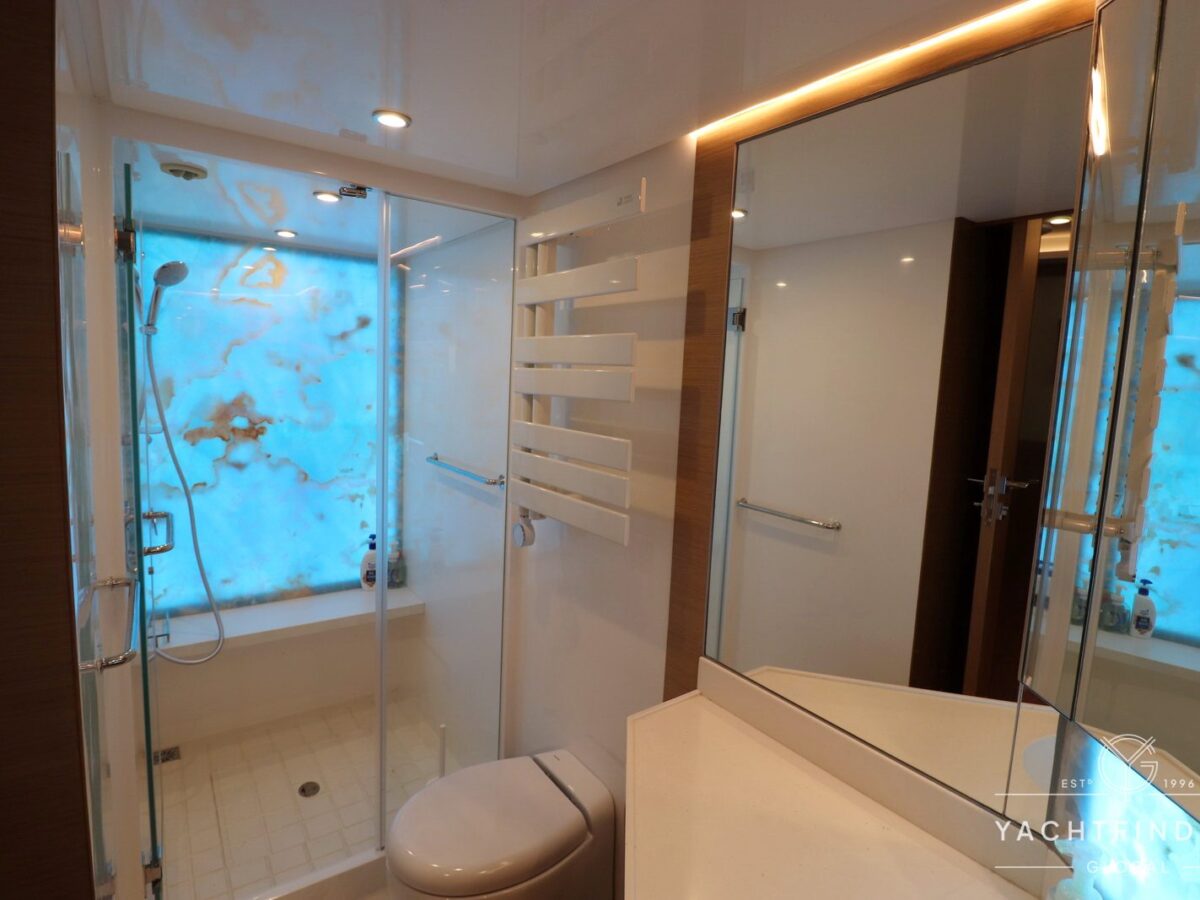 The yacht features a three-guest cabin layout, with the VIP double cabin in the bow having direct access to the forward head, which it shares with the twin cabin. The full-beam master cabin is amidship with a separate dressing room and a large head featuring a backlit, full-height stone panel in the shower.