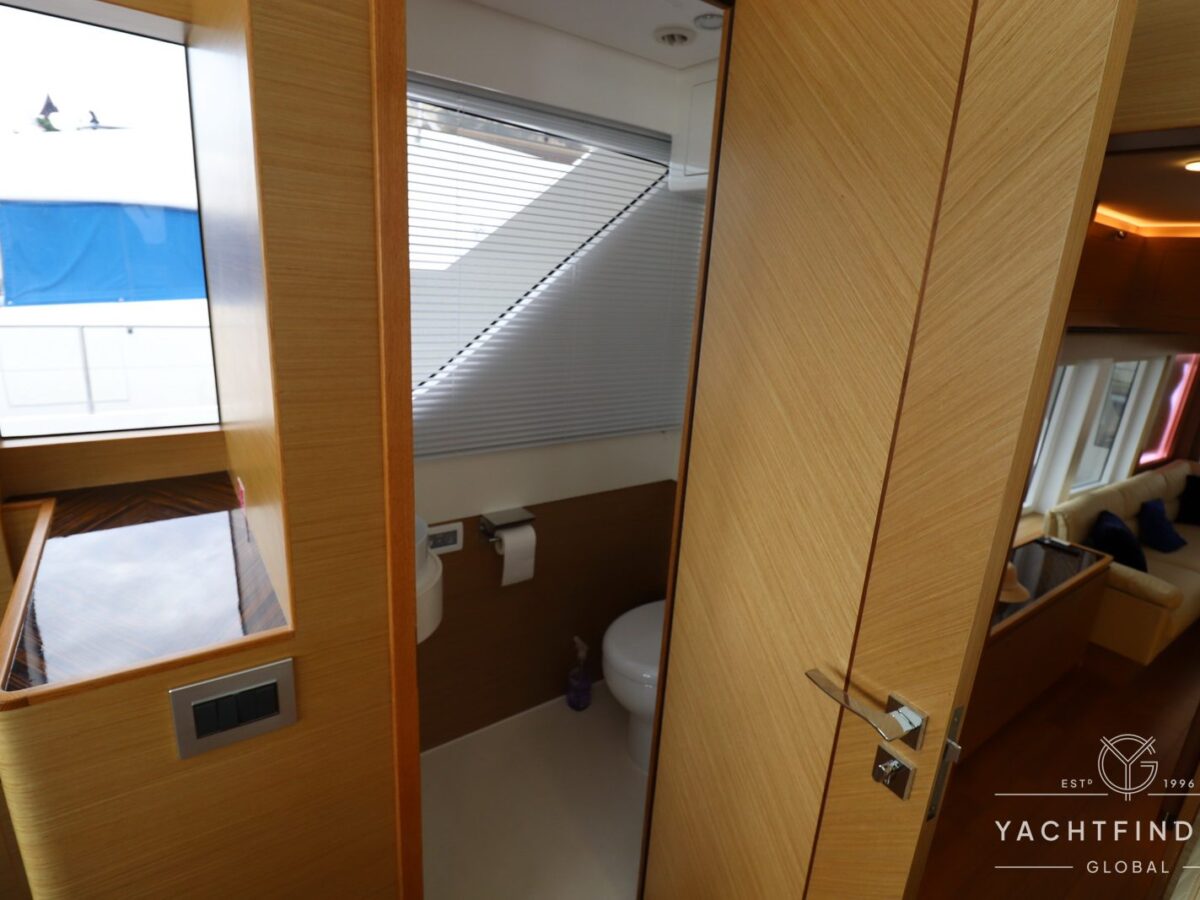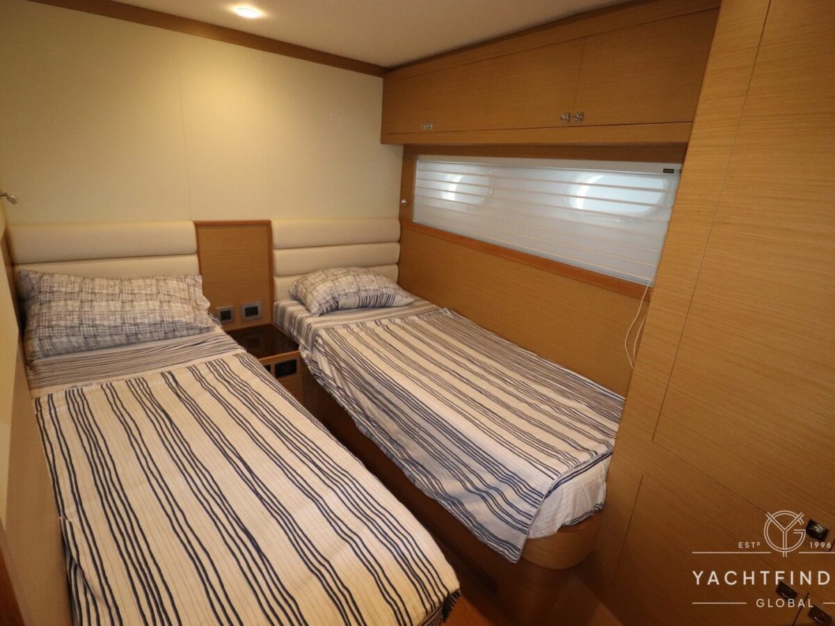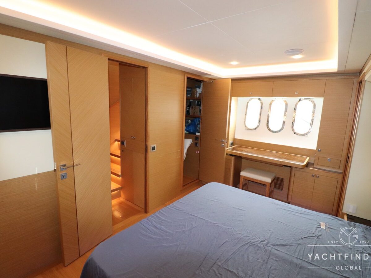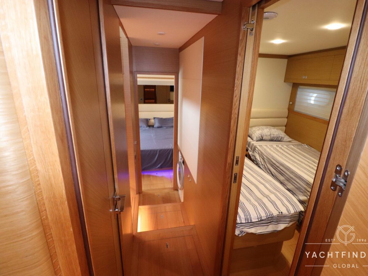 The yacht features a three-guest cabin layout, with the VIP double cabin in the bow having direct access to the forward head, which it shares with the twin cabin. The full-beam master cabin is amidship with a separate dressing room and a large head featuring a backlit, full-height stone panel in the shower.