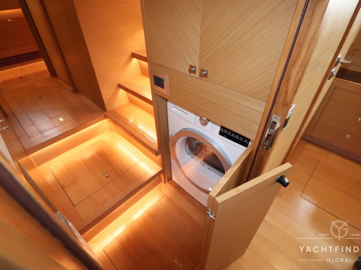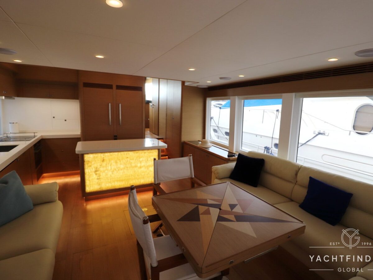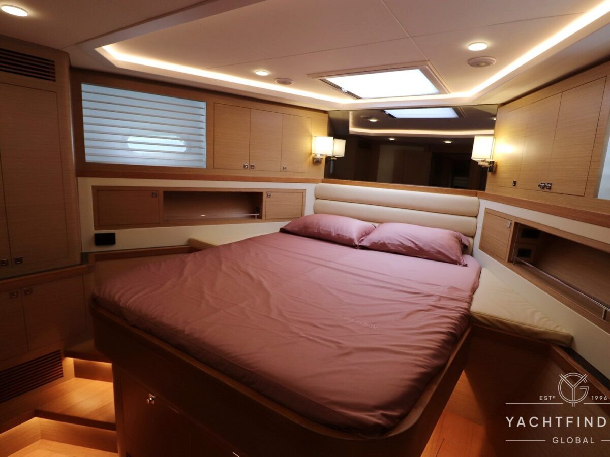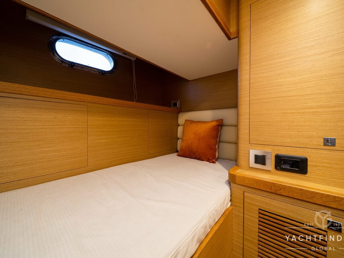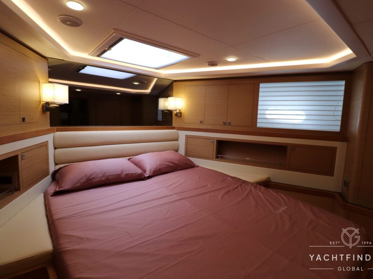 The yacht features a three-guest cabin layout, with the VIP double cabin in the bow having direct access to the forward head, which it shares with the twin cabin. The full-beam master cabin is amidship with a separate dressing room and a large head featuring a backlit, full-height stone panel in the shower.