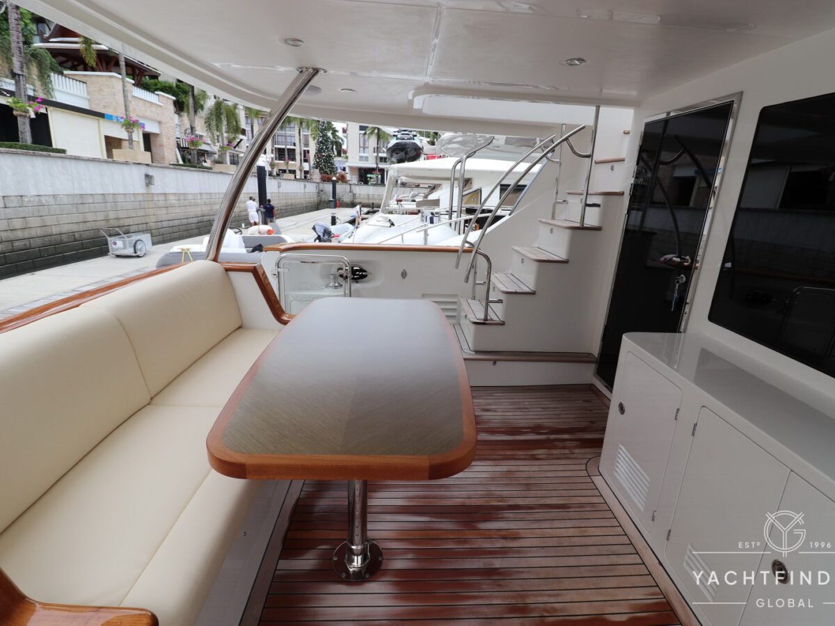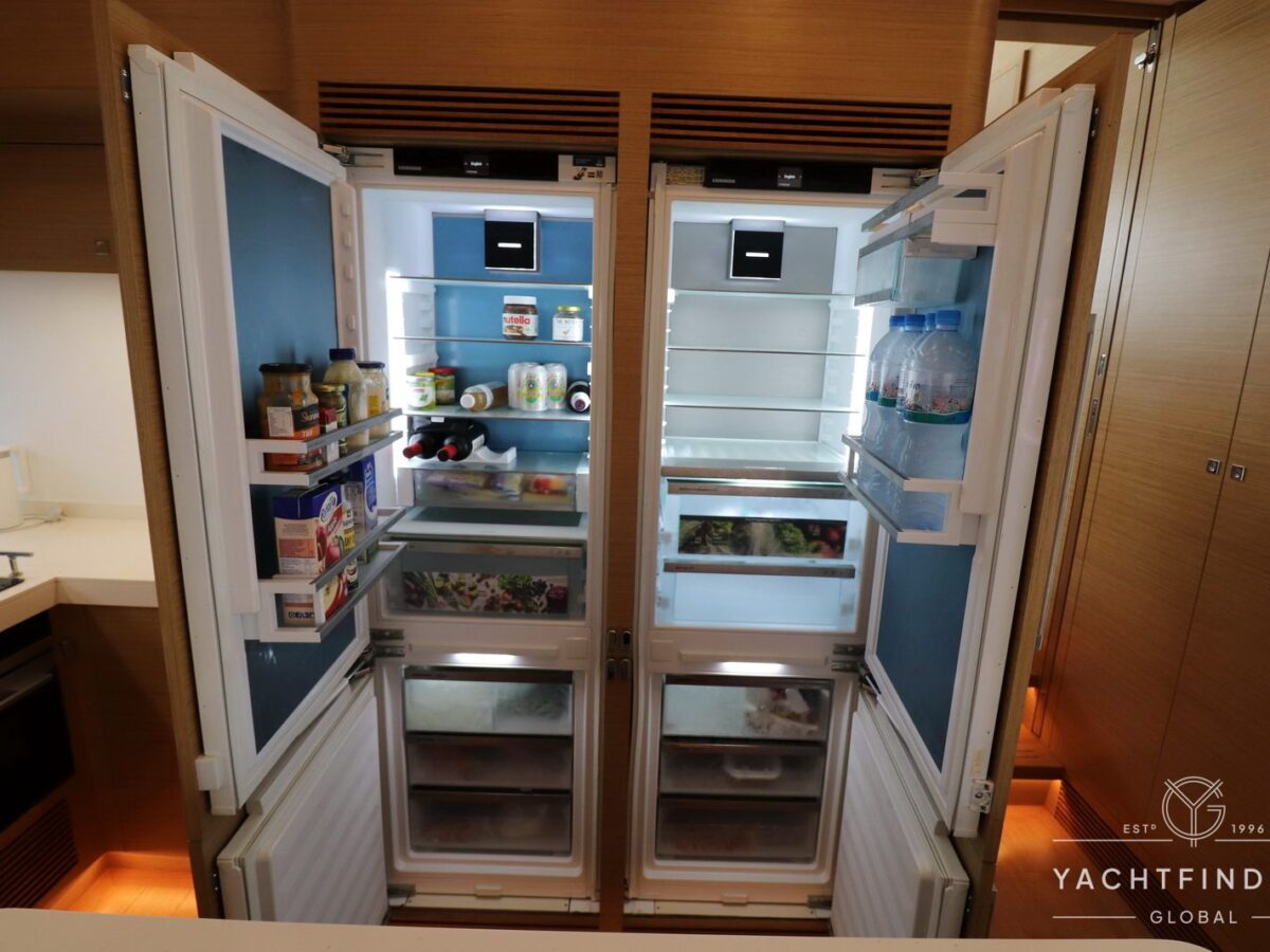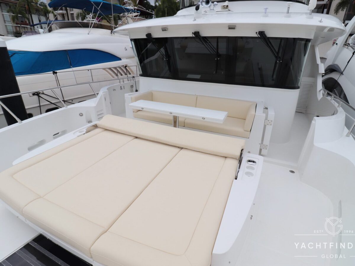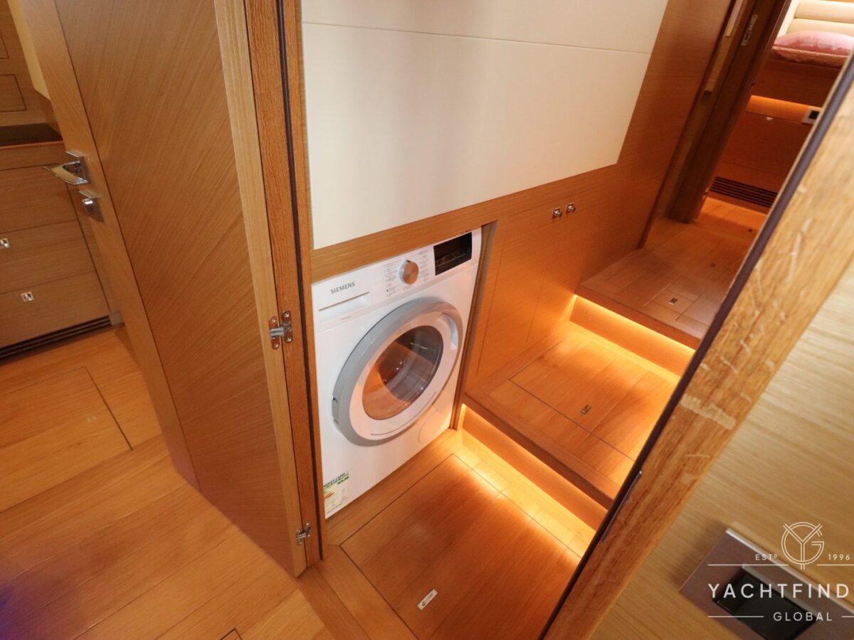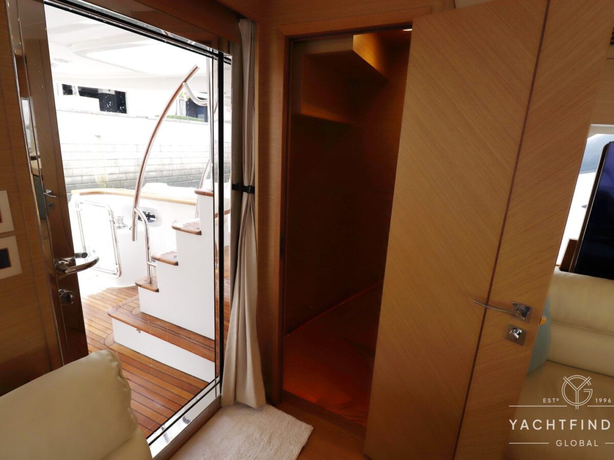 The yacht features a three-guest cabin layout, with the VIP double cabin in the bow having direct access to the forward head, which it shares with the twin cabin. The full-beam master cabin is amidship with a separate dressing room and a large head featuring a backlit, full-height stone panel in the shower.