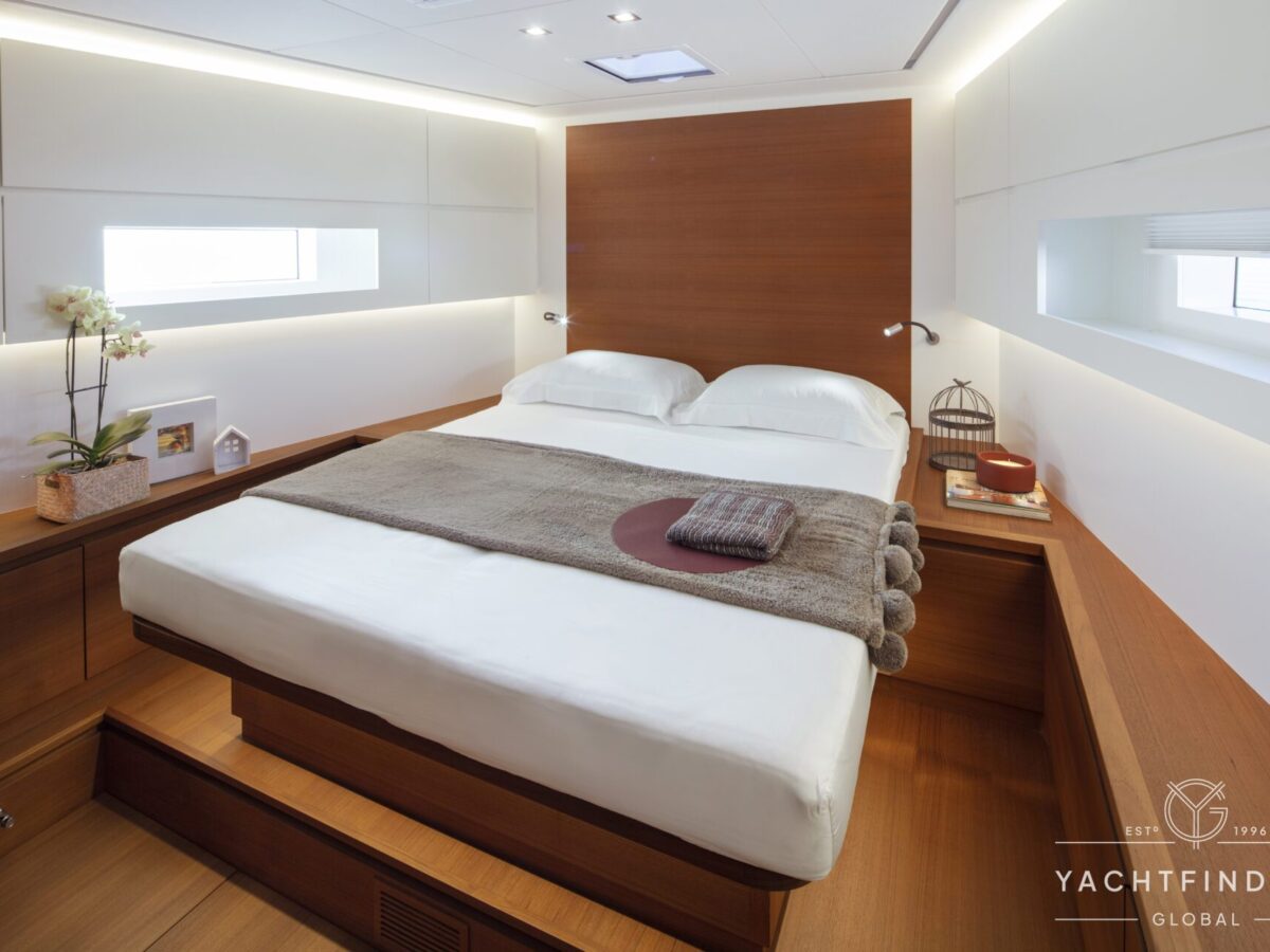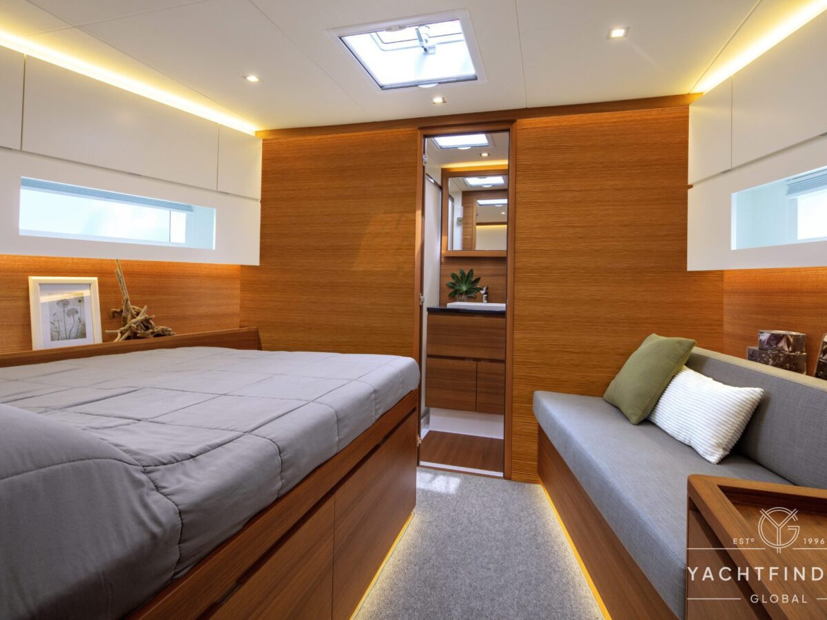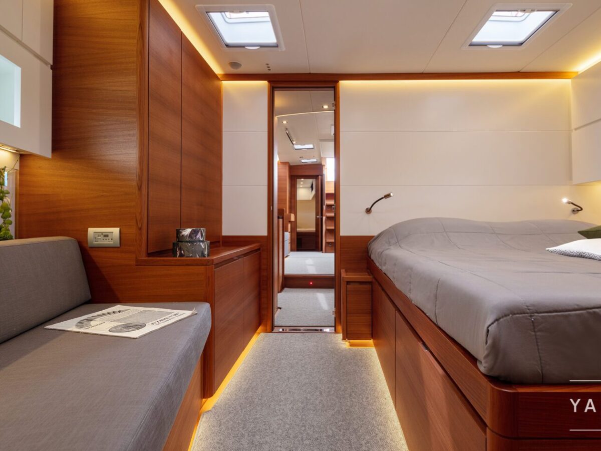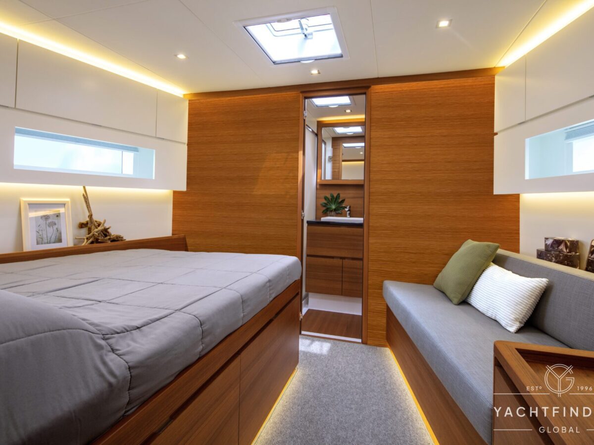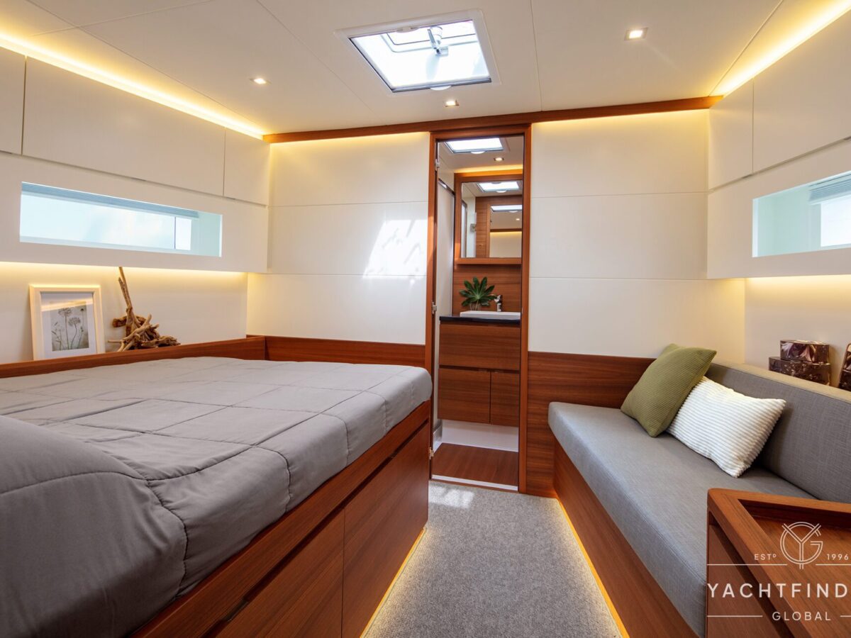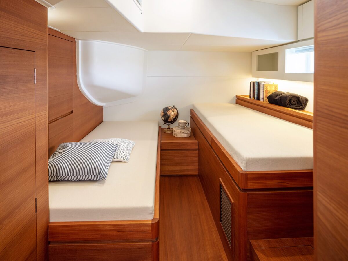 Below the deck, you will find a typical Solaris layout, which includes a galley slightly hidden by two steps forward and, for the first time, two aft cabins with single or double beds. A wide porthole faces the interior of the cockpit. The owner’s cabin, situated in the front, is vast and equipped with a wide capacity