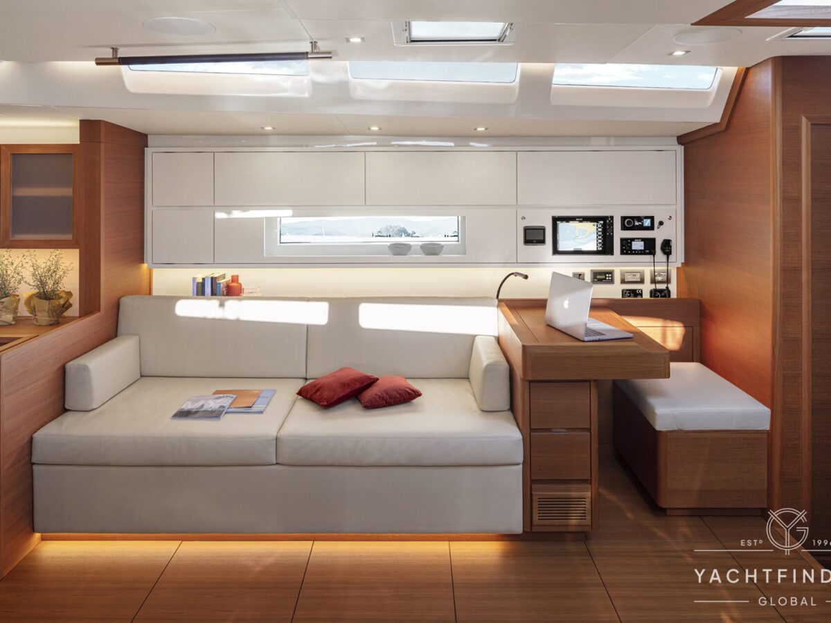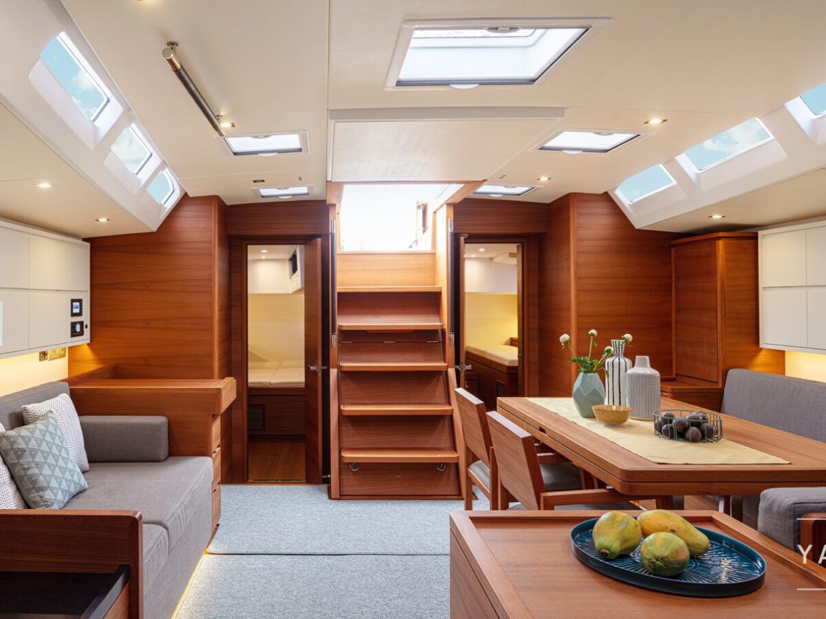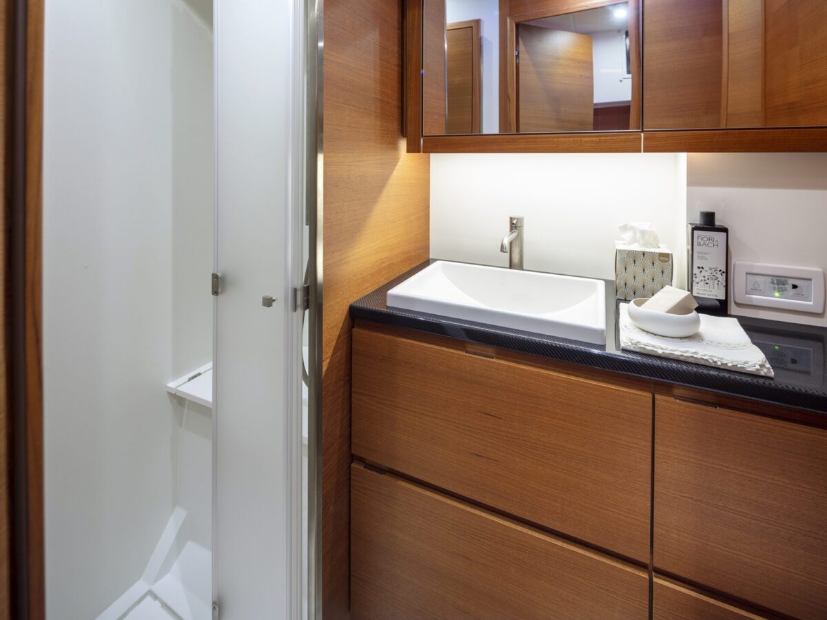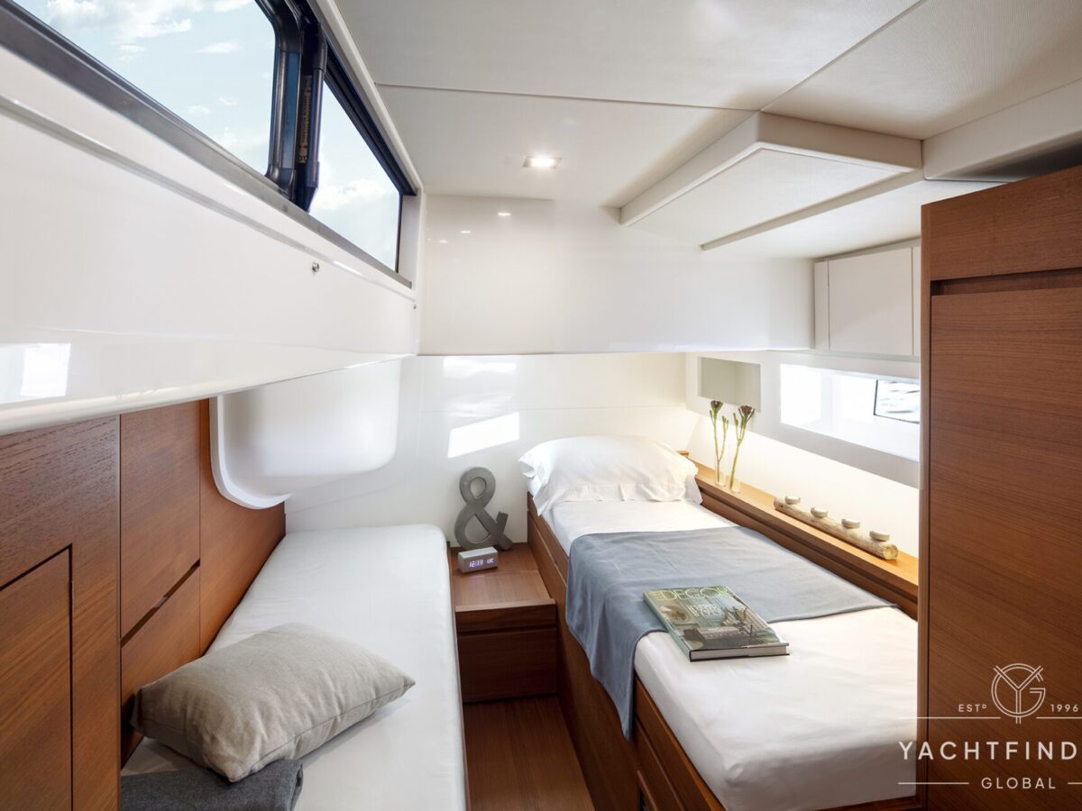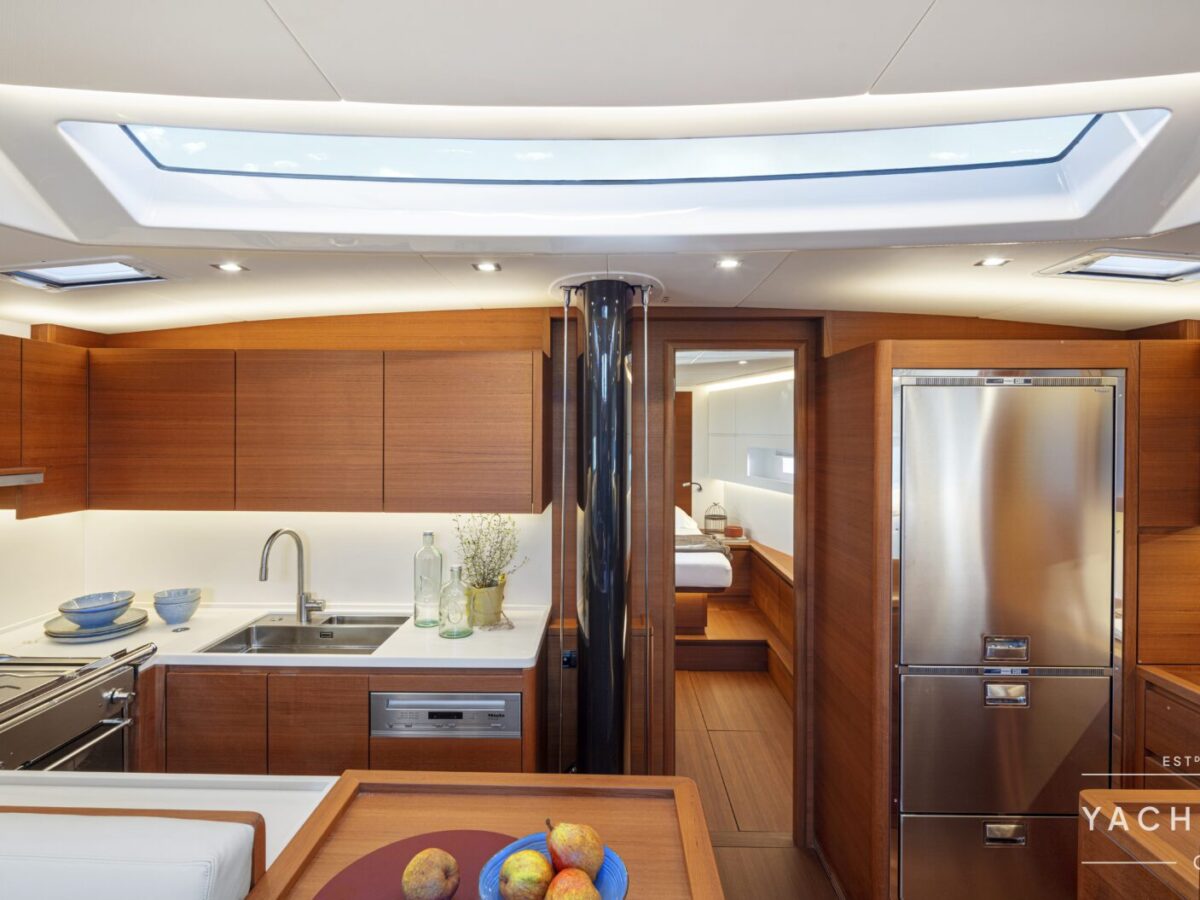 Below the deck, you will find a typical Solaris layout, which includes a galley slightly hidden by two steps forward and, for the first time, two aft cabins with single or double beds. A wide porthole faces the interior of the cockpit. The owner’s cabin, situated in the front, is vast and equipped with a wide capacity