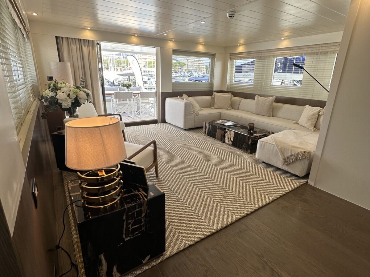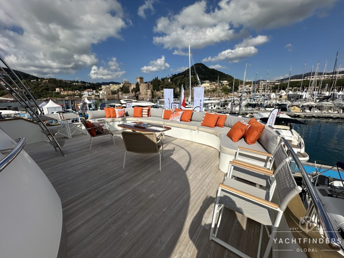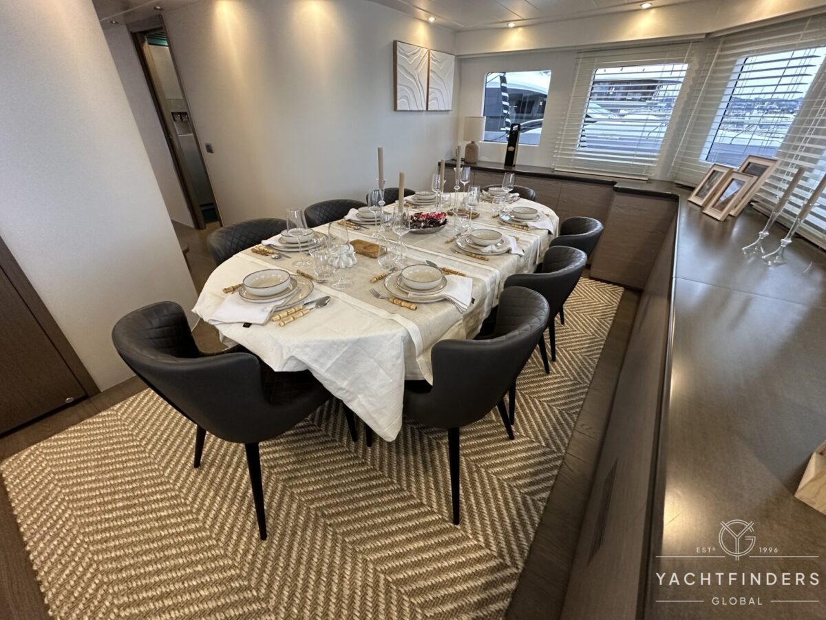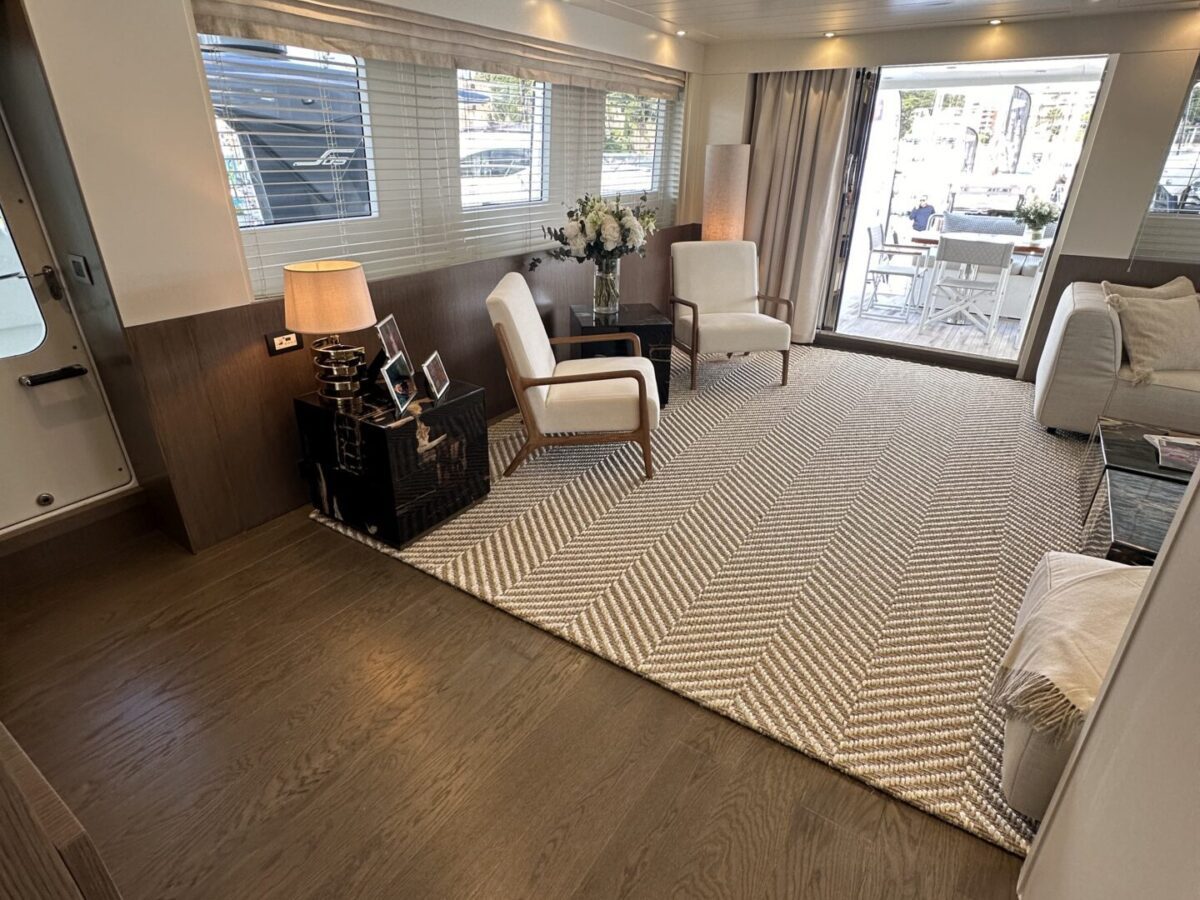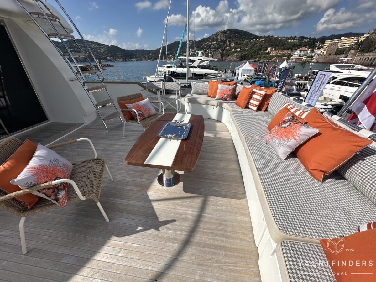 ”The Terranova T88 Yacht is a beautiful motor yacht with a timeless style. She can accommodate eight guests in 4 ensuite cabins, including a superb full-beam master cabin, a VIP, two twin cabins and a laundry room. The dining room offers a panoramic view. With one saloon on the main deck and one on the upper deck, this Terranova offers large volumes to enjoy with friends and family—a vast bow tender area for two large tenders and toys.