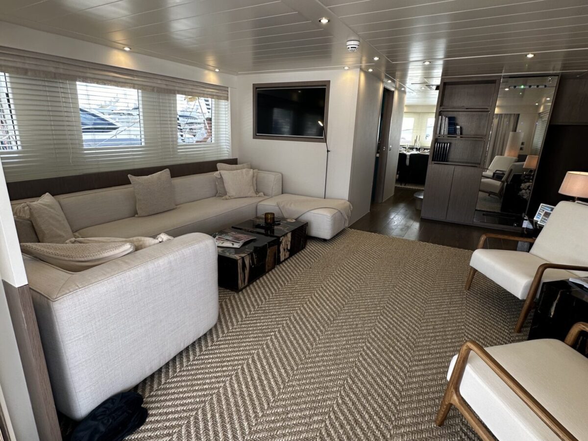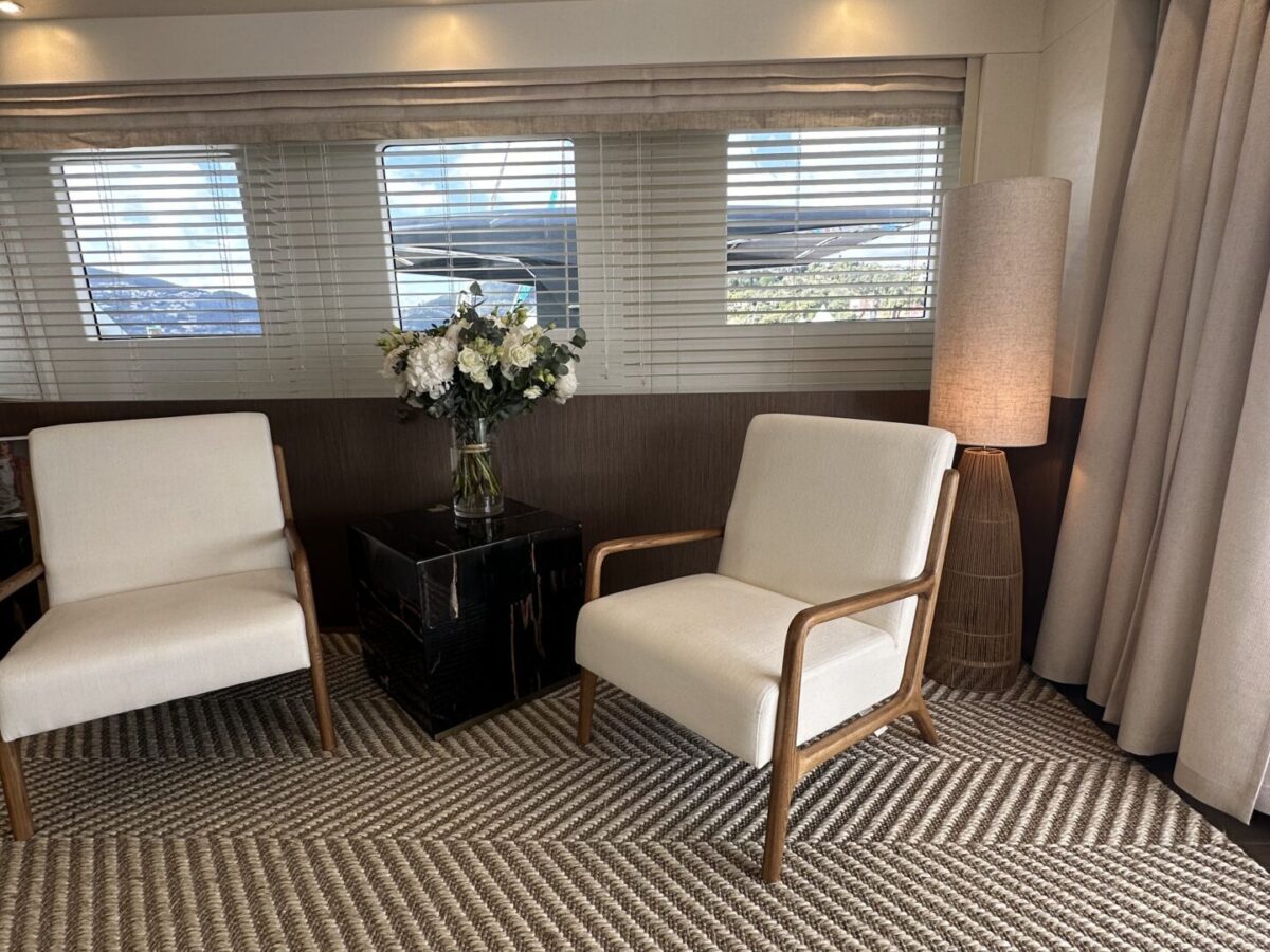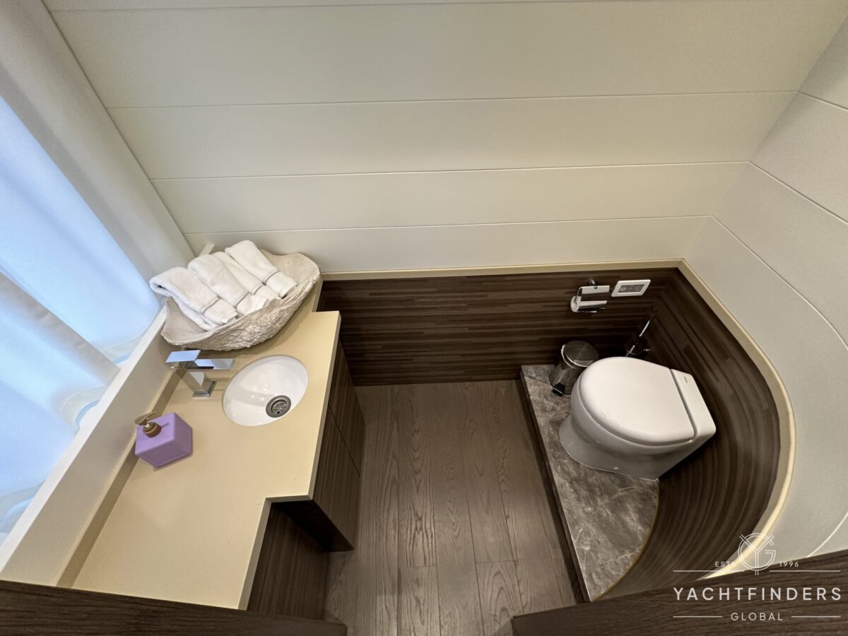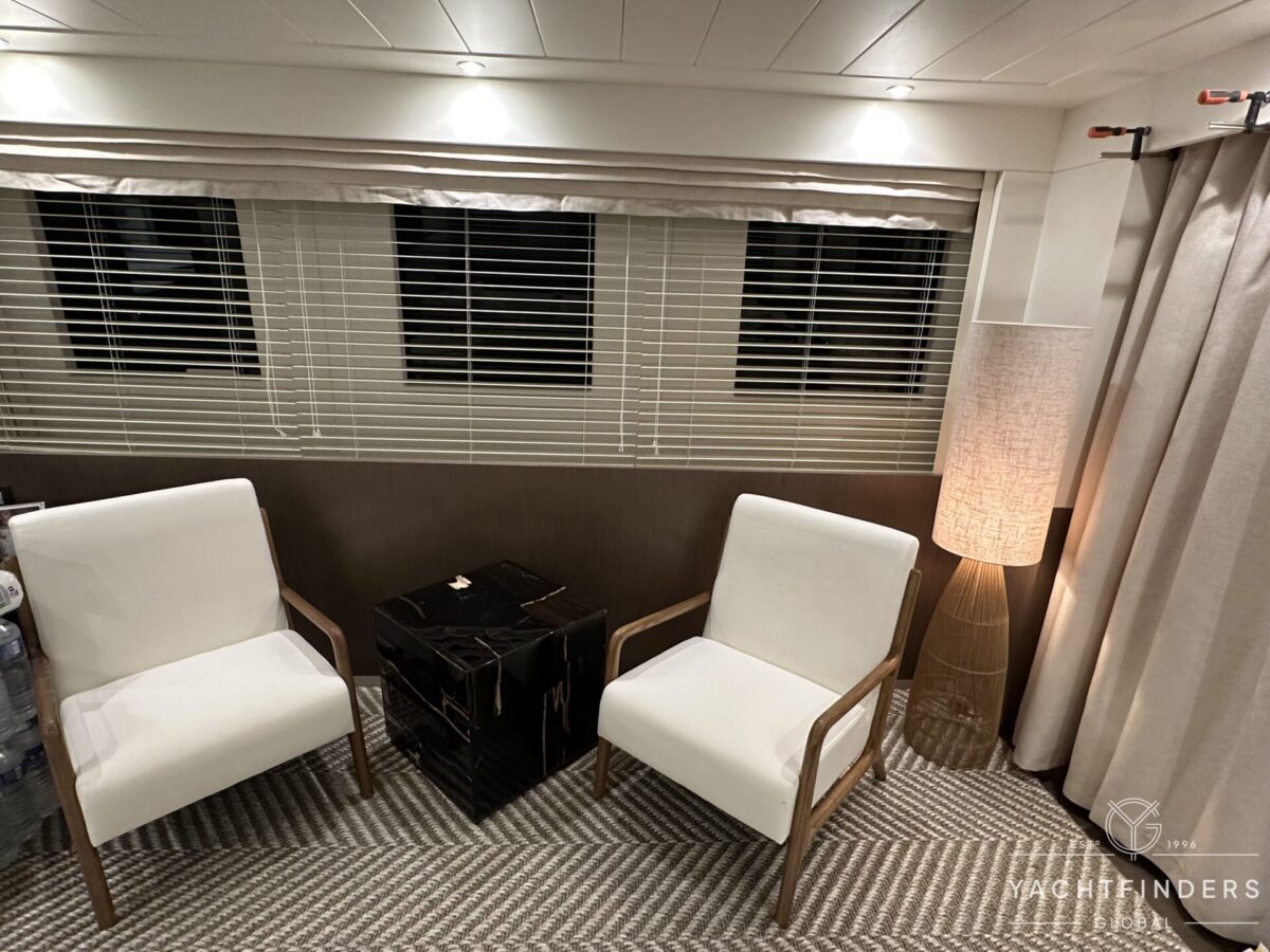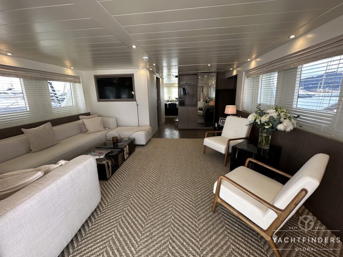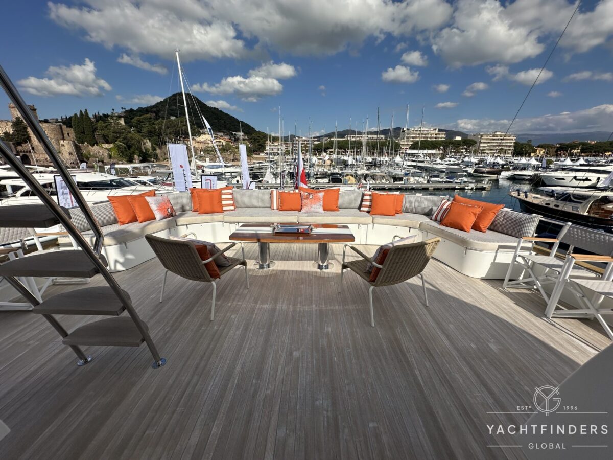”The Terranova T88 Yacht is a beautiful motor yacht with a timeless style. She can accommodate eight guests in 4 ensuite cabins, including a superb full-beam master cabin, a VIP, two twin cabins and a laundry room. The dining room offers a panoramic view. With one saloon on the main deck and one on the upper deck, this Terranova offers large volumes to enjoy with friends and family—a vast bow tender area for two large tenders and toys.